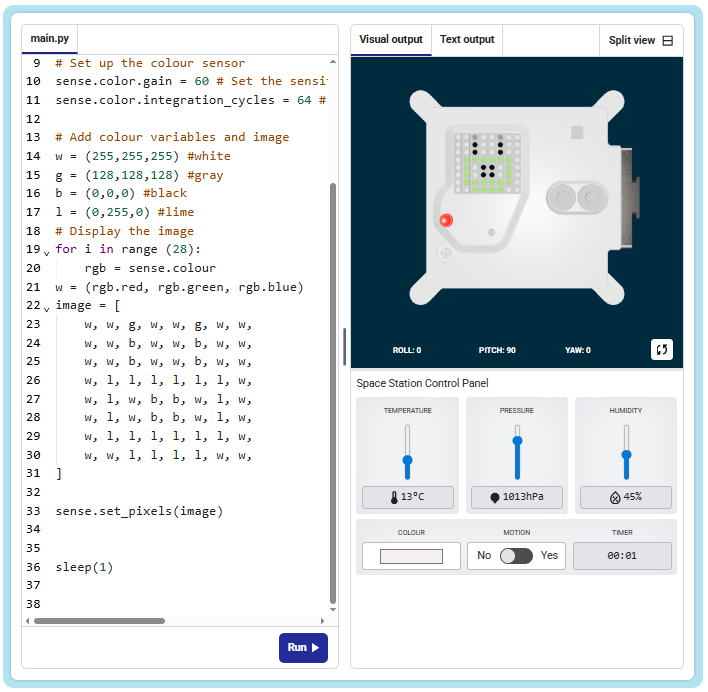 A repeat loop was added to the program to make sure it displayed for the allotted 30 seconds. Within the repeat loop, they wrote code to interact with the luminosity sensor, which would alter one of the colours depending on the ambient light. They used another variable, this time to store a list of the colour variables in the order they would display on the screen to create the image. Finally, they wrote a final line of code to make the image display.